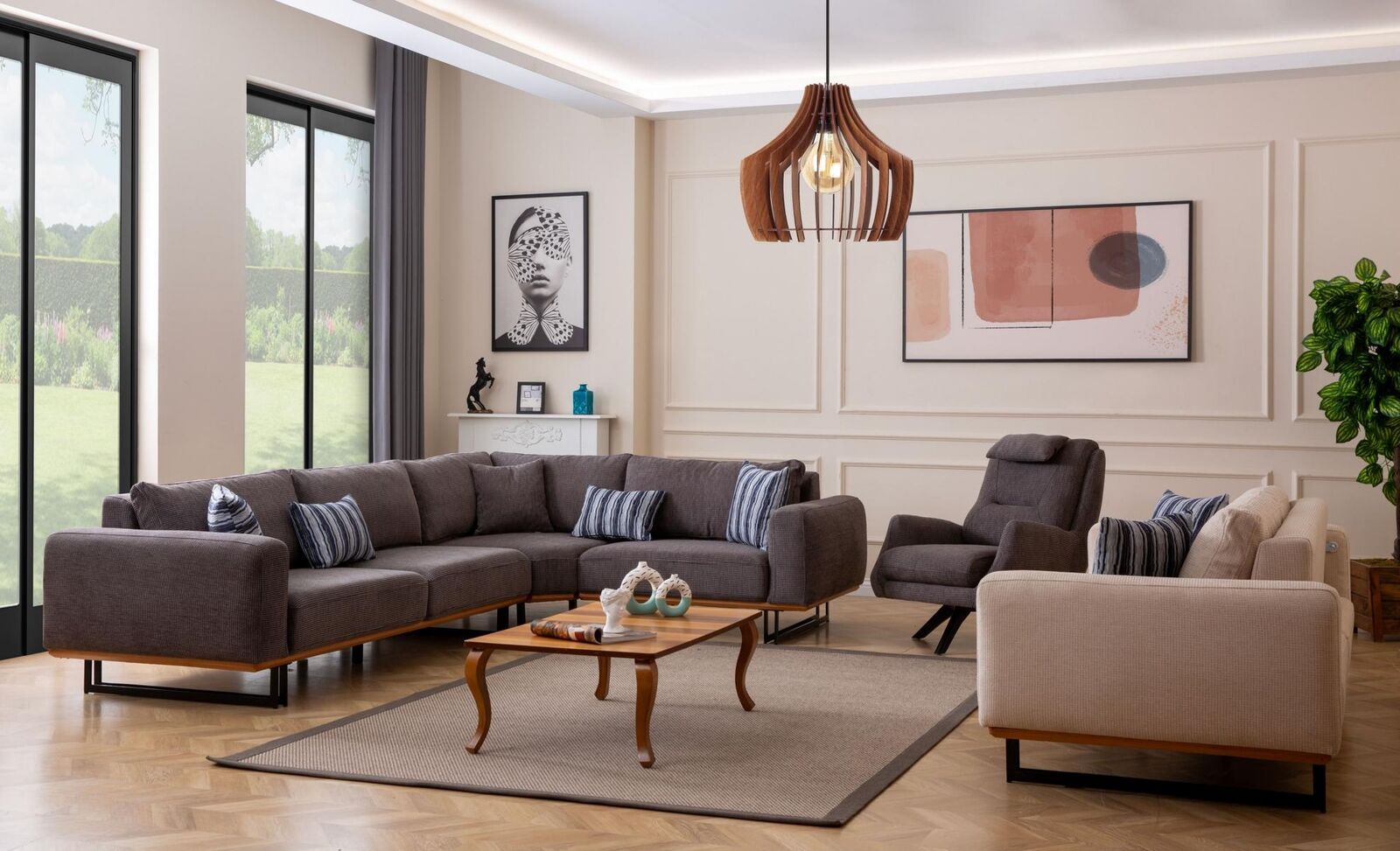 Verschönern Sie Ihr Wohnzimmer mit unserem Designer Wohnzimmer Set von XL Mobel! Dieses 3-teilige Set besteht aus einer eleganten Ecksofa-Landschaft in L-Form, einem geräumigen 3-Sitzer-Sofa und einem gemütlichen Sessel. Gefertigt aus hochwertigem Holz und Textil in der Farbe wie abgebildet, verleihen diese Möbelstücke Ihrem Zuhause einen Hauch von Luxus. Das Ecksofa hat beeindruckende Maße von ca. 325 x 230 cm und bietet sowohl Komfort als auch Stil. Mit einer Sitzhöhe von ca. 42 cm und einer Sitztiefe von ca. 64 cm können Sie sich bequem entspannen. Der 3-Sitzer-Sofa ist ca. 230 x 97 x 75 cm groß und der Sessel misst ca. 88 x 80 x 80 cm. Profitieren Sie von unserer großen Auswahl an Möbeln und gönnen Sie sich dieses exklusive Wohnzimmer Set. Erhältlich in anderen Farben auf Anfrage. Holen Sie sich jetzt dieses Set und verwandeln Sie Ihr Wohnzimmer in eine stilvolle Oase der Entspannung!